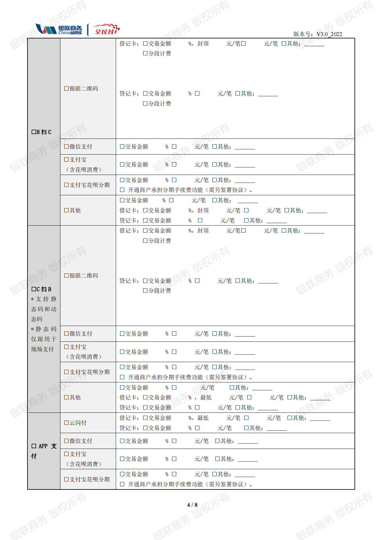 銀聯商務特約商戶支付業務申請書V3.0_2022
